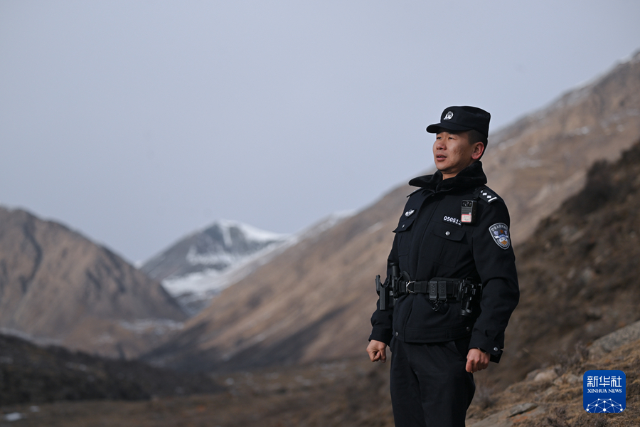 1月9日,在青海省海北藏族自治州门源回族自治县境内的老虎沟,民警郭建业在用望远镜查看远处。新华社记者 张龙 摄