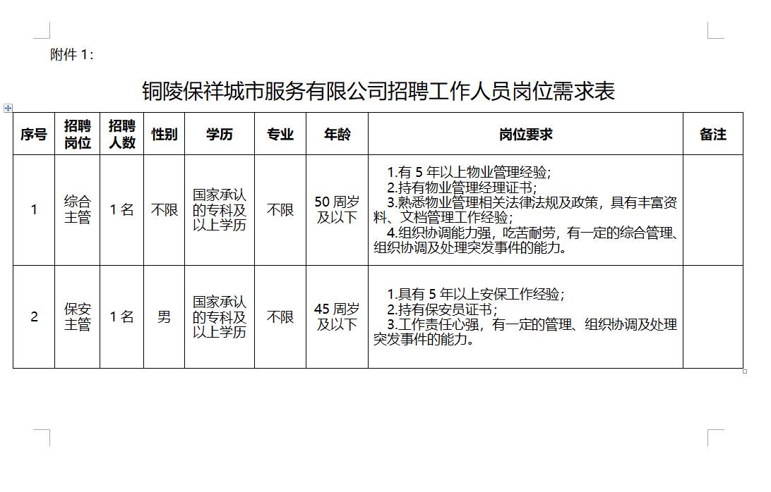 附件1:銅陵保祥城市服務有限公司招聘工作人員崗位需求表